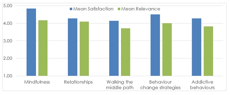 The team presented their evaluation of the course together with future recommendations. The group was suggested to be a useful addition to the comprehensive DBT programme, with service users reporting that they learnt useful skills that they were able to apply to their daily lives. The graph below details the service user’s feedback regarding the satisfaction and relevance of each of the sessions.
